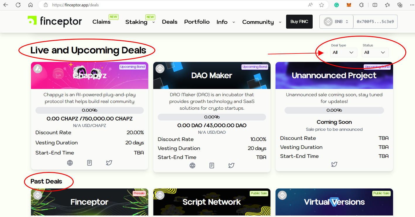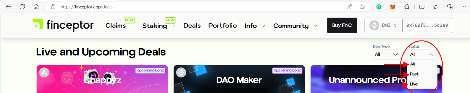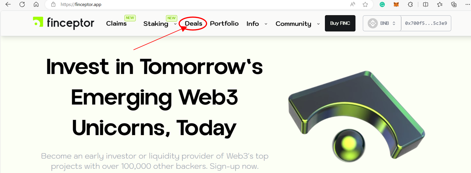 To browse past, live, and upcoming sales on Finceptor, click on the "Deals" button at the top of the Finceptor website's homepage.