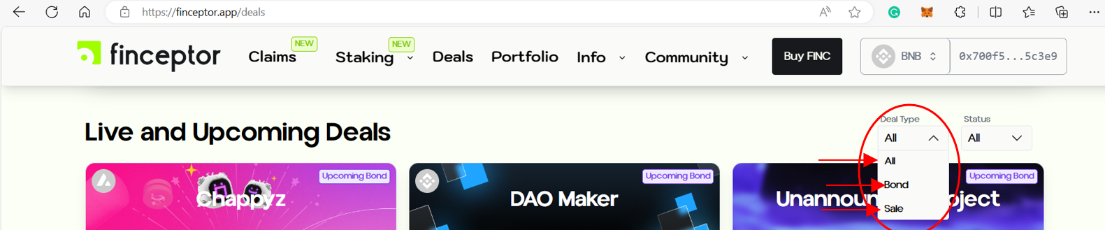 On the right side of the page, by clicking the "Deal Type" button, you can choose to view all sales by selecting the "All" option, view only IDOs by selecting the "Sale" option, and view only Bond sales by selecting the "Bond" option.