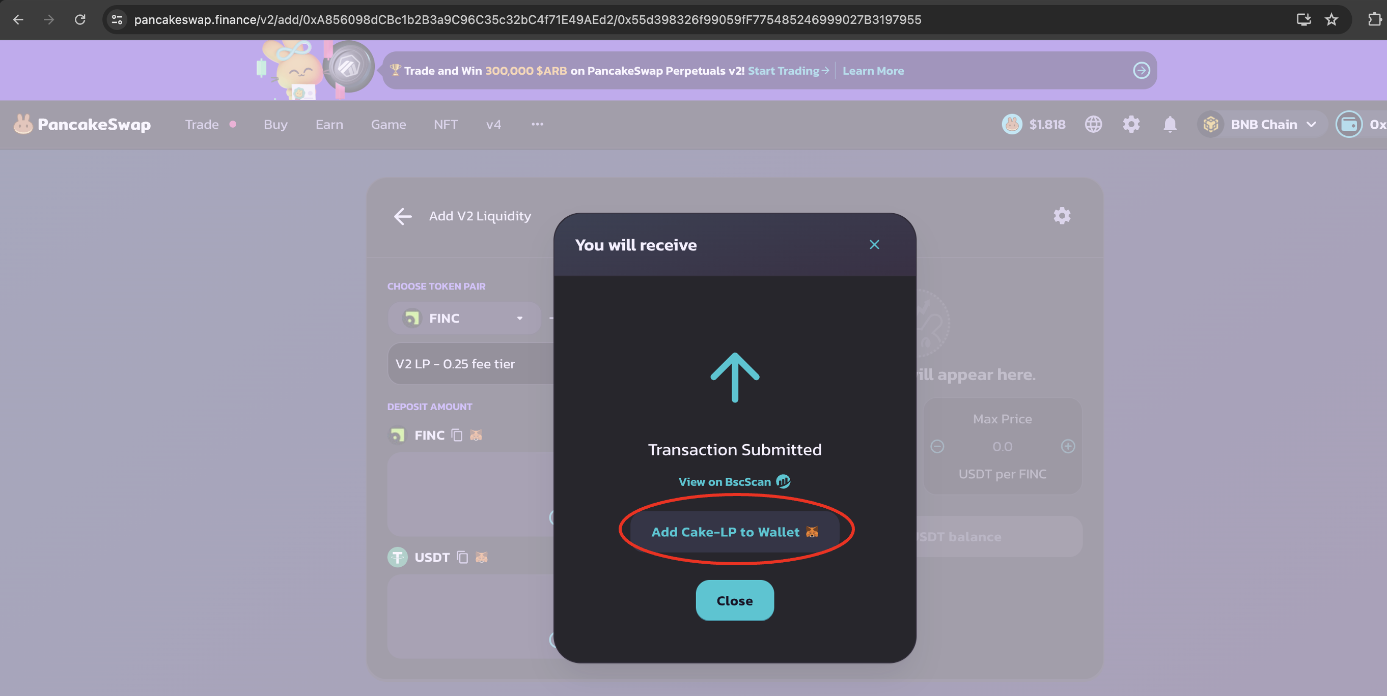 Ensure that you have sufficient $FINC and $USDT balances and enter the amounts to be provided as liquidity.