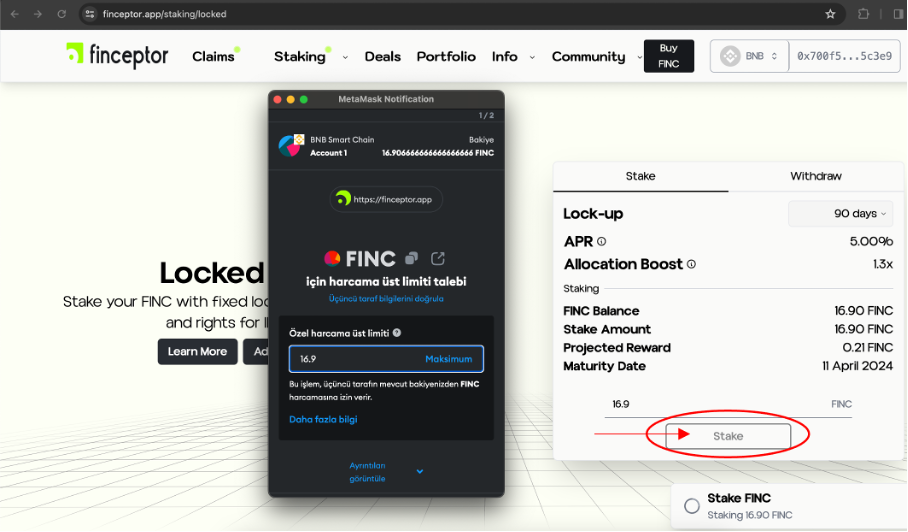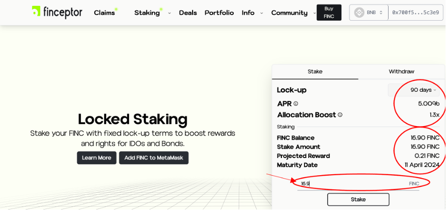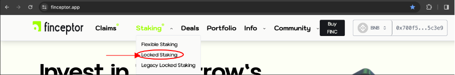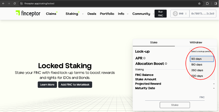 To stake $FINC in the locked staking pool, head over to the official page and connect your Web3 wallet.