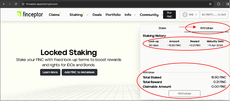 To review the details of your locked stakings, click on the 'Withdraw' tab. You can observe your staking history with projected reward and maturity date, total staked amount, total reward, and claimable amount.